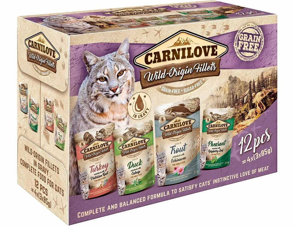 Taschen mit Wildfleischstücken in Filets. Komplettes Futter oder leckeres Topping zum Granulat. Einzigartige Fleischsorten Hoher Fleischgehalt 85% Kein Getreide Keine Kartoffeln Kein GVO, keine Konservierungsstoffe, keine Farbstoffe 3x reich in der Türkei angereichert mit Baldrian 3x Entenreich, angereichert mit Katzenminze 3x reich an Forellen, angereichert mit Echinacea 3x reich an Fasanen, angereichert mit Himbeerblättern ZUTATEN Reich in der Türkei angereichert mit Baldrian. Zutaten: 85% Fleisch in Filets (71% Huhn, 14% Pute), 1% Baldrianwurzel, 1% Leinöl, 0,5% Mineralien, 0,5% Pflanzenstärke. Analytische Komponenten: Rohprotein 9,0%, Rohfett 4,0%, Rohfaser 0,5%, Rohasche 2,5%, Feuchtigkeit 82,0%, Calcium 0,15%, Phosphor 0,2%, Natrium 0,3%, Omega-3 0,2%. Reich an Enten, angereichert mit Katzenminze. Zutaten: 85% Fleisch in Filets (71% Huhn, 14% Ente), 1% Shanta, 1% Leinöl, 0,5% Mineralien, 0,5% Pflanzenstärke. Analytische Komponenten: Rohprotein 8,5%, Rohfett 4,5%, Rohfaser 0,5%, Rohasche 2,2%, Feuchtigkeit 82,0%, Calcium 0,2%, Phosphor 0,2%, Natrium 0,3%, Omega-3 0,2%. Reich an Forellen, angereichert mit Echinacea. Zutaten: 85% Fleisch in Filets (71% Huhn, 14% Forelle), 1% Echinacea, 1% Leinöl, 0,5% Mineralien, 0,5% Pflanzenstärke. Analytische Komponenten: Rohprotein 7,5%, Rohfett 4,0%, Rohfaser 0,5%, Rohasche 2,0%, Feuchtigkeit 82,0%, Calcium 0,15%, Phosphor 0,2%, Natrium 0,3%, Omega-3 0,25%. Reich an Fasanen, angereichert mit Himbeerblättern. Zutaten: 85% Fleisch in Filets (71% Huhn, 14% Fasan), 1% Himbeerblatt, 1% Leinöl, 0,5% Mineralien, 0,5% Pflanzenstärke. Analytische Komponenten: Rohprotein 8,0%, Rohfett 4,8%, Rohfaser 0,5%, Rohasche 2,1%, Feuchtigkeit 82,0%, Calcium 0,15%, Phosphor 0,2%, Natrium 0,3%, Omega 3 0,2%.