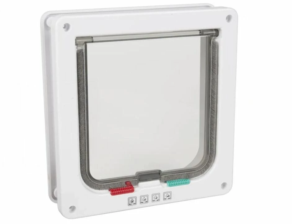 – Geräuschlos, Leicht zu montieren, Mit 4 Positionen, Mit Bürstendichtung, Mit Schiebeknopf, Mit Tunnel, Mit einer transparente Klappe, Schablone einschließlich