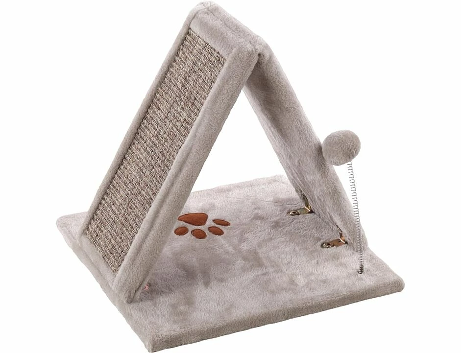 Katzenkratzbaum in Form eines Dreiecks mit Spielzeug.
