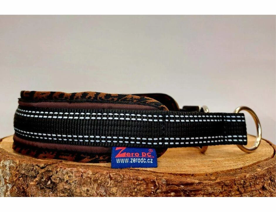 Breiter und weicher, halb versenkbarer Hundehalsband mit reflektierenden Elementen mit der Möglichkeit, die Länge einzustellen. Der Hundehalsband ist mit einem zarten Band gefüttert, das dem Produkt einen luxuriösen Look verleiht, aber sehr sanft zu Fell und Haut des Hundes ist.