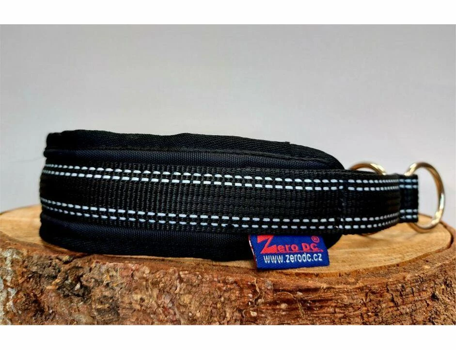 Breiter und weicher, halb versenkbarer Hundehalsband mit reflektierenden Elementen mit der Möglichkeit, die Länge einzustellen. Der Hundehalsband ist mit einem zarten Band gefüttert, das dem Produkt einen luxuriösen Look verleiht, aber sehr sanft zu Fell und Haut des Hundes ist.
