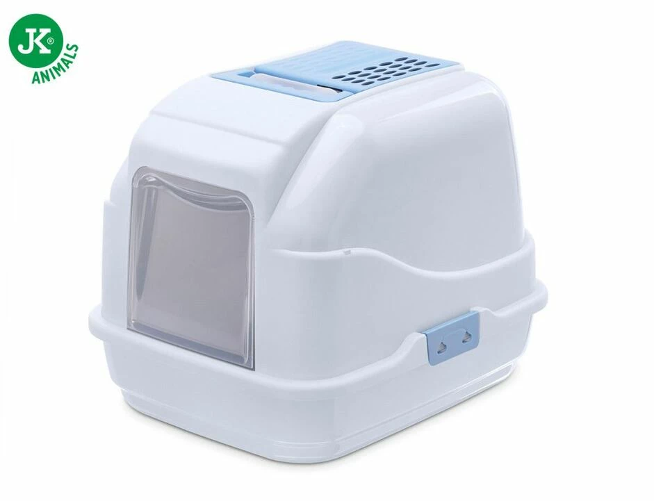 Eine überdachte Toilette mit Tür, Filter und Schaufel dient der Sauberkeit bei der Haltung einer Katze in der Wohnung.