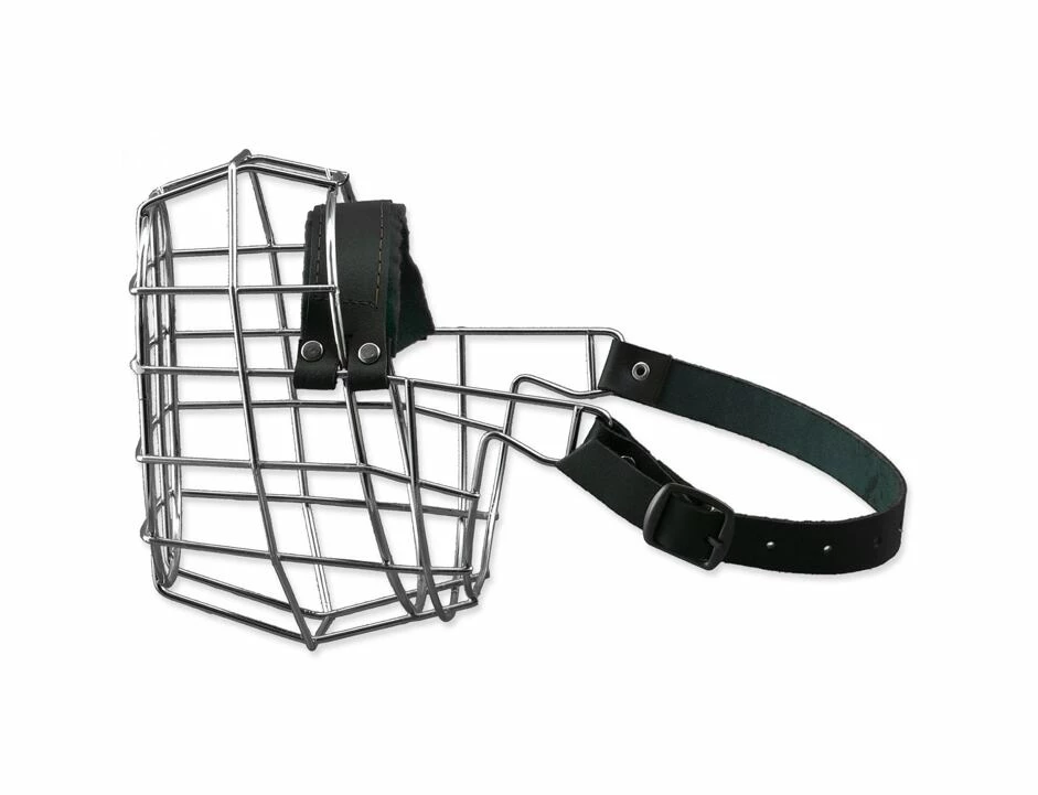Metall-Maulkorb mit Lederriemen zur Befestigung der Hündin Boxer.
