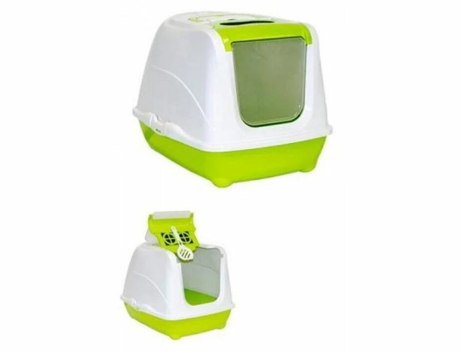 Toilette für Katzen mit Kunststoffabdeckung, Tür, Filter und Streuschaufel.