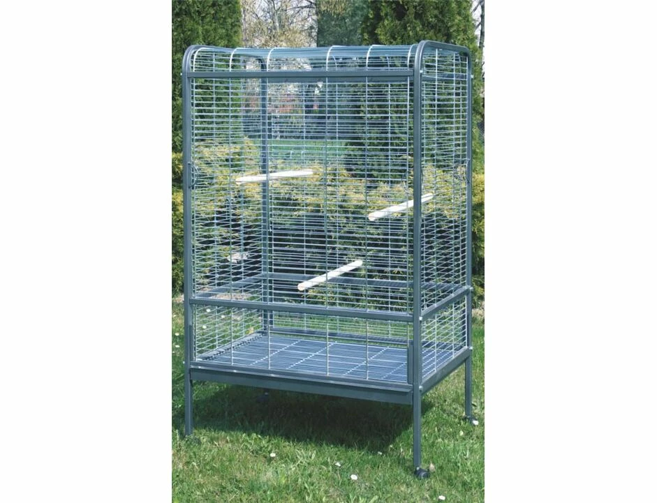 Voliere für mittlere und große Papageien. Stabile und sichere Konstruktion. Praktische Elemente und reichhaltiges Zubehör. Einfach zu säubern. Langanhaltender Abgang. Holzsitzstangen im Produkt enthalten. Aufbau auf Rädern. Ausziehbarer Boden. Schutzkante gegen Volierenverschmutzung.